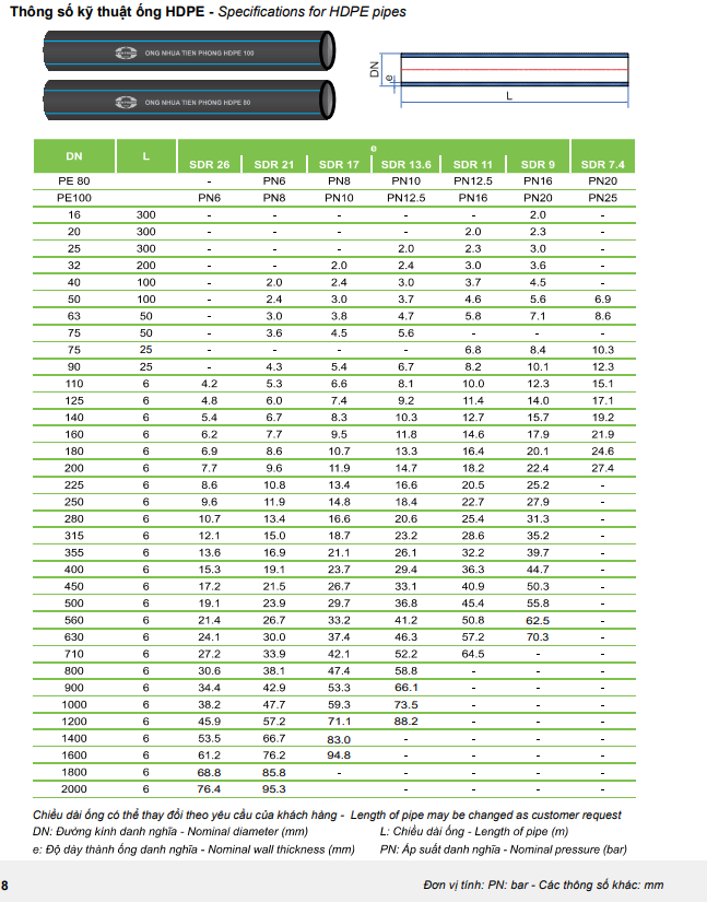 Bảng thông số quy cách đường kính, độ dày các loại ống nhựa HDPE